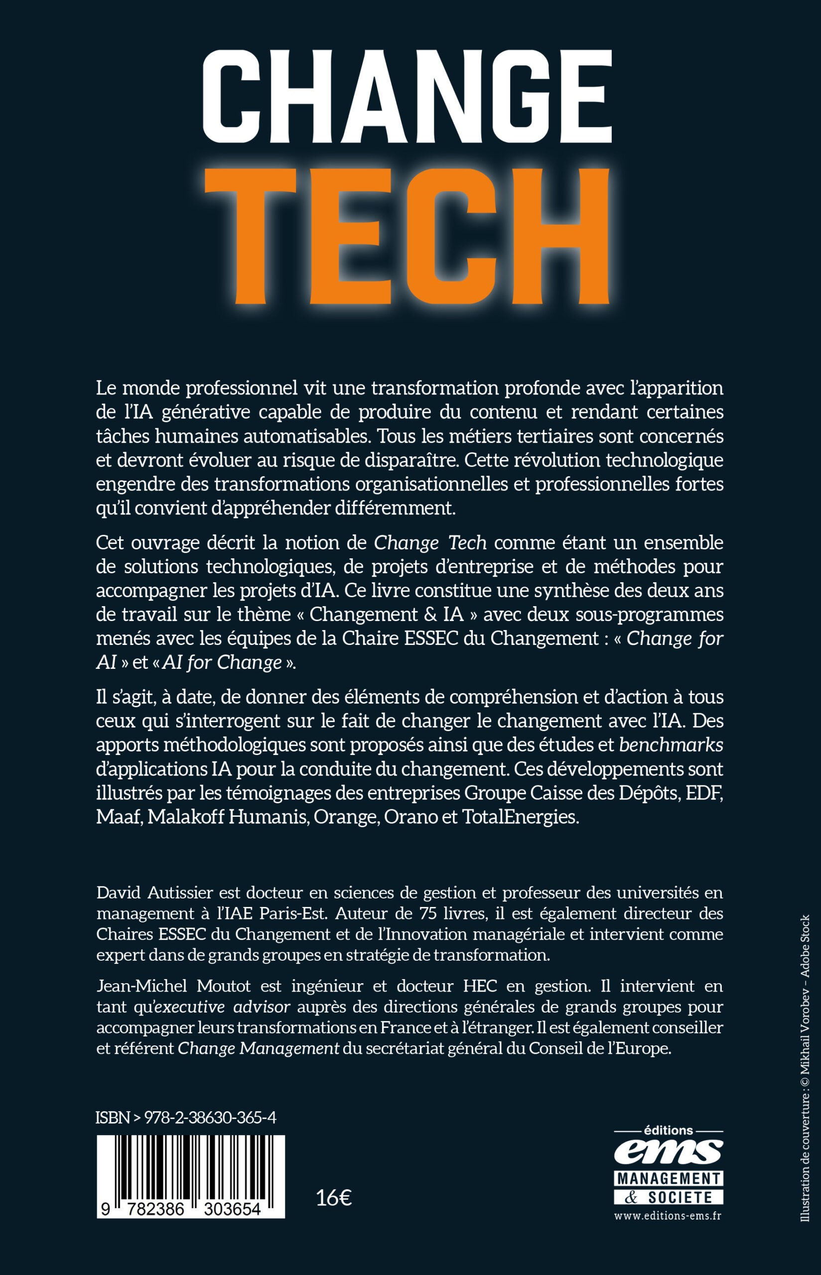 Cet ouvrage décrit la notion de Change Tech comme étant un ensemble de solutions technologiques, de projets d’entreprise et de méthodes pour accompagner les projets d’IA. Ce livre constitue une synthèse des deux ans de travail sur le thème « Changement & IA » avec deux sous-programmes menés avec les équipes de la Chaire ESSEC du Changement : « Change for AI » et « AI for Change ».