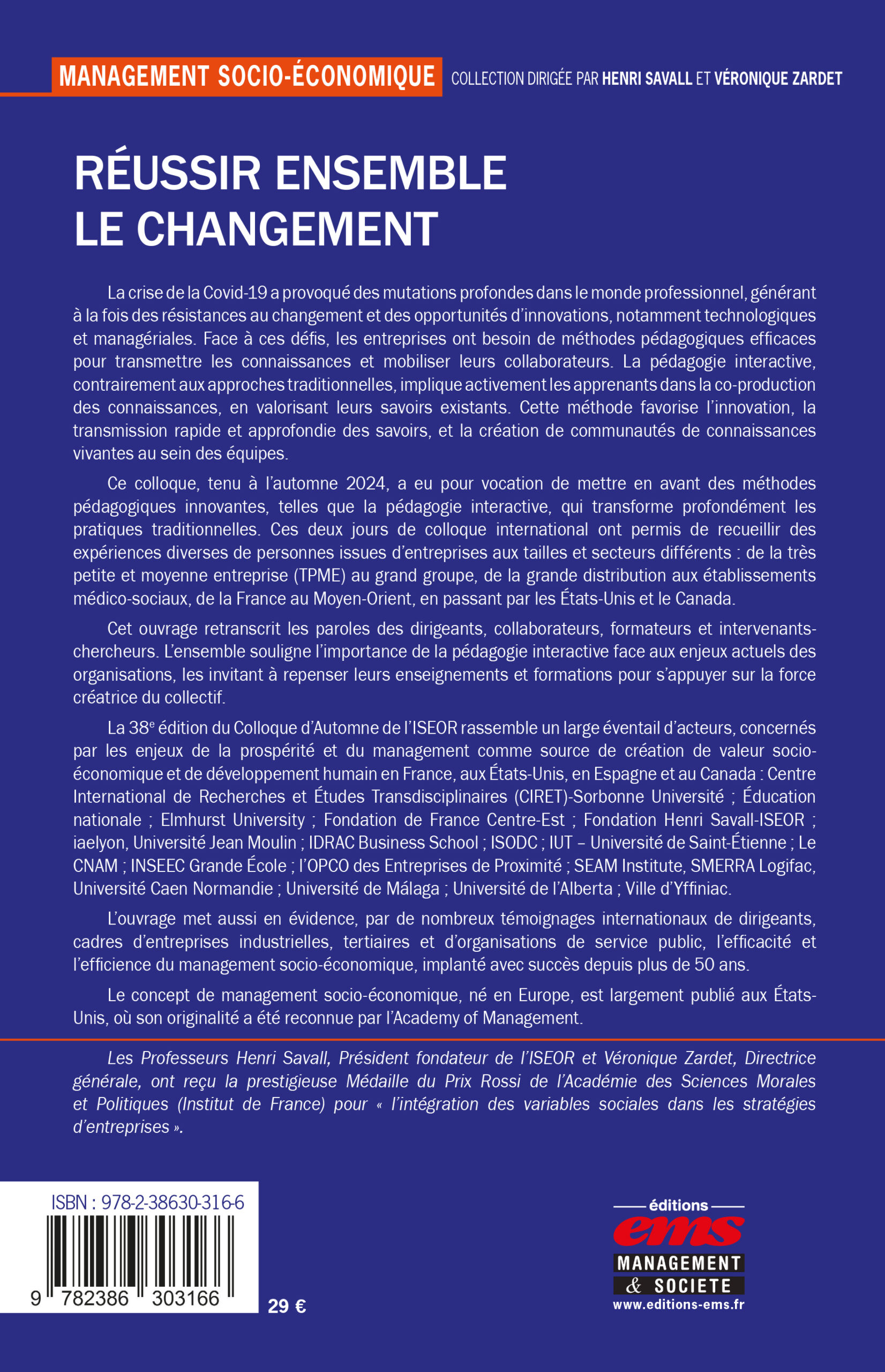 La 38e édition du Colloque d’Automne de l’ISEOR rassemble un large éventail d’acteurs, concernés par les enjeux de la prospérité et du management comme source de création de valeur socioéconomique et de développement humain en France, aux États-Unis, en Espagne et au Canada : Centre International de Recherches et Études Transdisciplinaires (CIRET)-Sorbonne Université ; Éducation nationale ; Elmhurst University ; Fondation de France Centre-Est ; Fondation Henri Savall-ISEOR ; iaelyon, Université Jean Moulin ; IDRAC Business School ; ISODC ; IUT – Université de Saint-Étienne ; Le CNAM ; INSEEC Grande École ; l’OPCO des Entreprises de Proximité ; SEAM Institute, SMERRA Logifac, Université Caen Normandie ; Université de Málaga ; Université de l’Alberta ; Ville d’Yffiniac. L’ouvrage met aussi en évidence, par de nombreux témoignages internationaux de dirigeants, cadres d’entreprises industrielles, tertiaires et d’organisations de service public, l’efficacité et l’efficience du management socio-économique, implanté avec succès depuis plus de 50 ans. Le concept de management socio-économique, né en Europe, est largement publié aux États- Unis, où son originalité a été reconnue par l’Academy of Management.